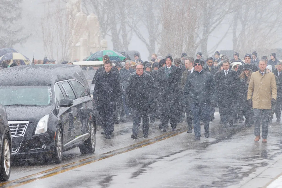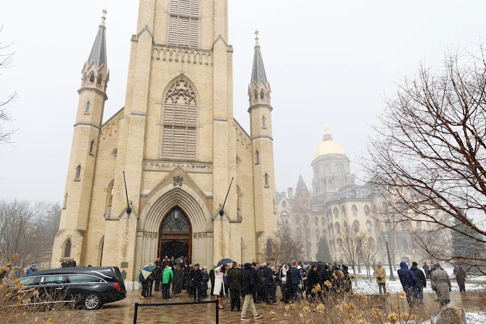 The funeral procession for former Notre Dame football head coach Lou Holtz at the Basilica of the Sacred Heart at the University of Notre Dame on Monday, March 16, 2026, in South Bend. Holtz died on March 4, 2026.