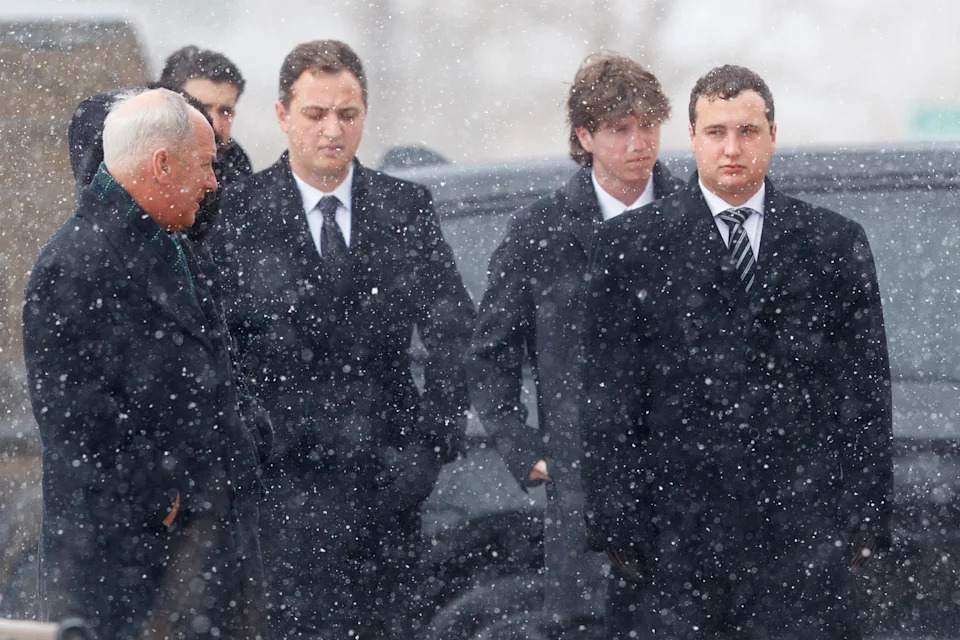 The pallbearers for former Notre Dame football head coach Lou Holtz arrive at Holtz’s funeral service at the Basilica of the Sacred Heart at the University of Notre Dame on Monday, March 16, 2026, in South Bend. Holtz died on March 4, 2026.
