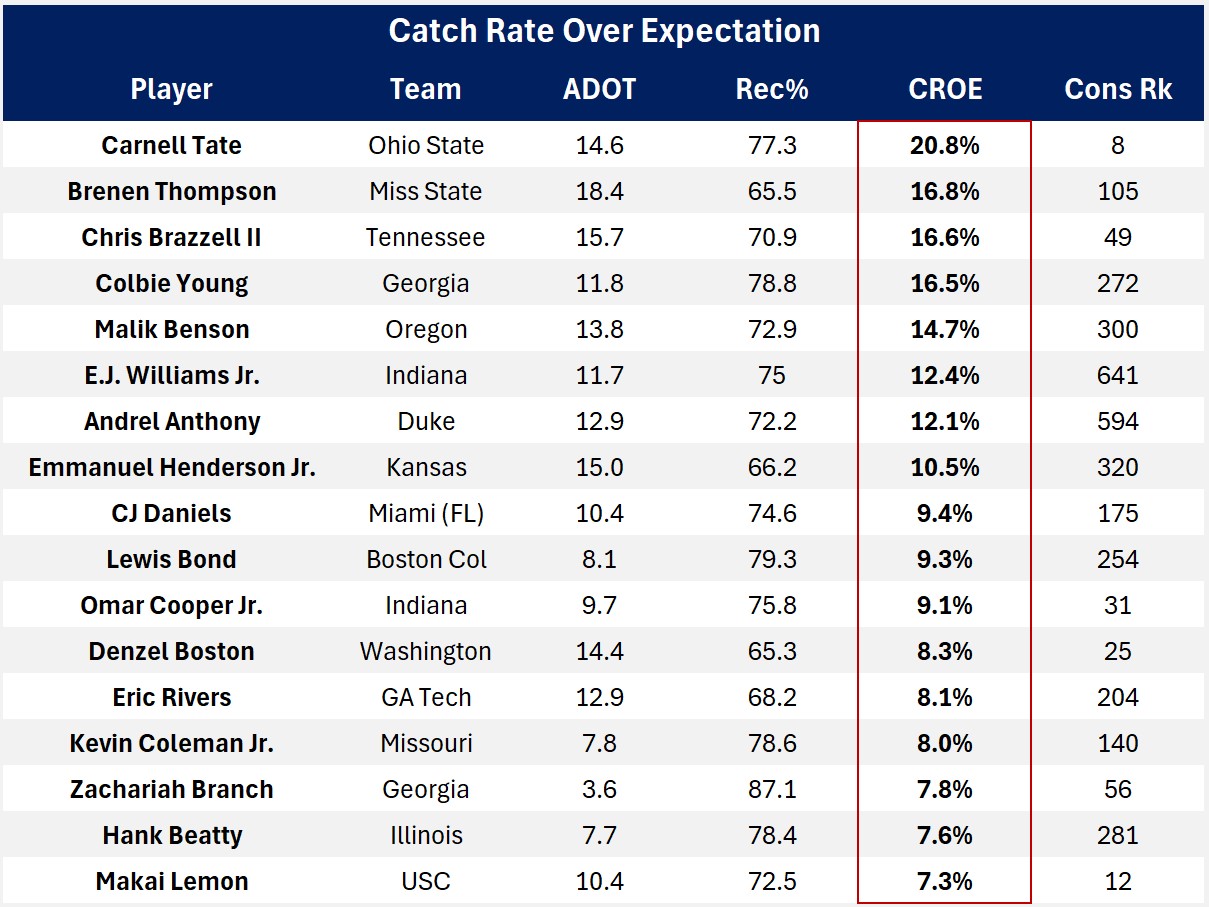 To avoid spurious small sample effects, I set a limit of 10 contested targets. That eliminated a few other high CROE WRs with high CTC%: Andrel Anthony (CTC 77.8%), Emmanuel Henderson Jr (CTC 75.0%), and Zachariah Branch (CTC 62.5%).