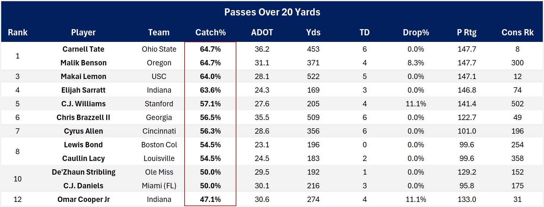 Carnell Tate tied for the lead with Malik Benson in Catch Rate and Passer Rating (P Rtg) on targets over 20 yds. But Tate clearly separates from the rest of the pack on balance of production and productivity stats on deep balls, including some I didn’t show in the table.