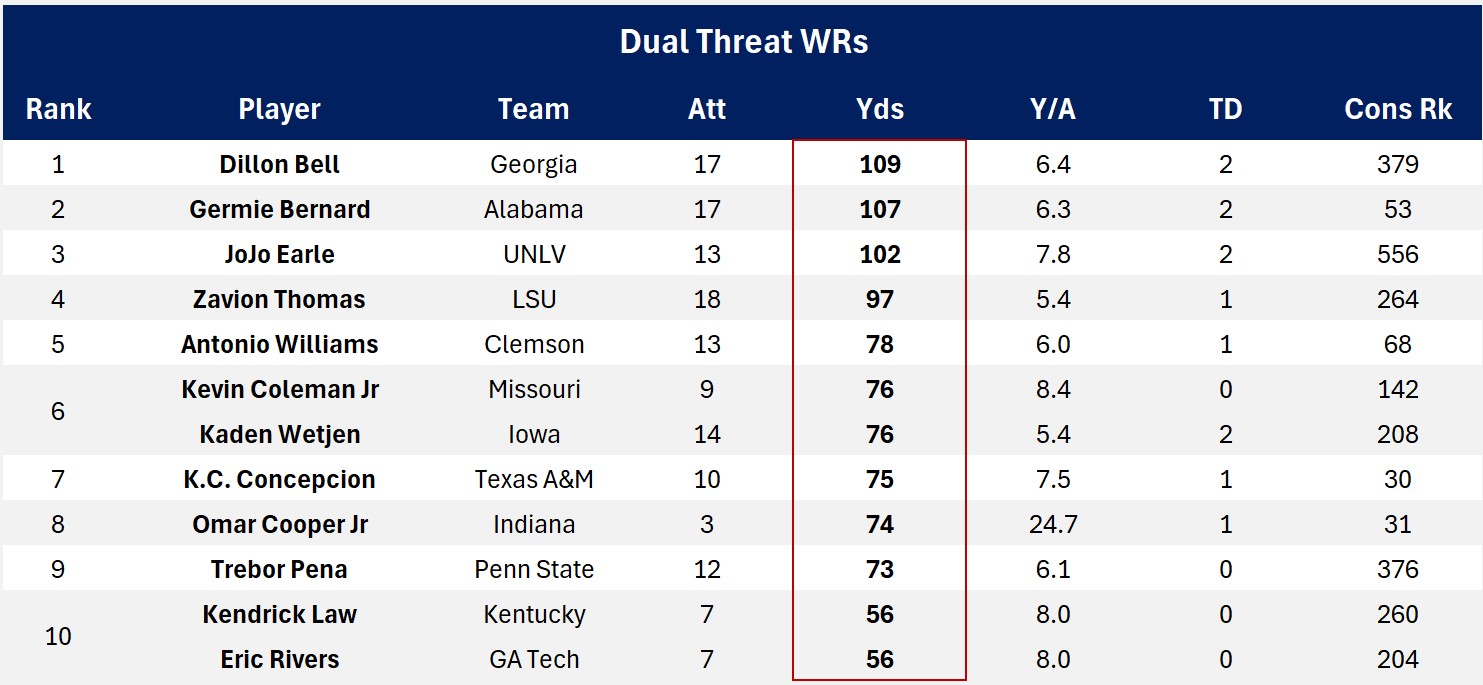 The WR rushing yards leader was Georgia’s Dillon Bell. He is a powerful, explosive wideout who does his best work after he gets the ball in his hands (5.2 YAC/Rec receiving, 3.47 YAC/att rushing). But Bell is not really much of a receiver.