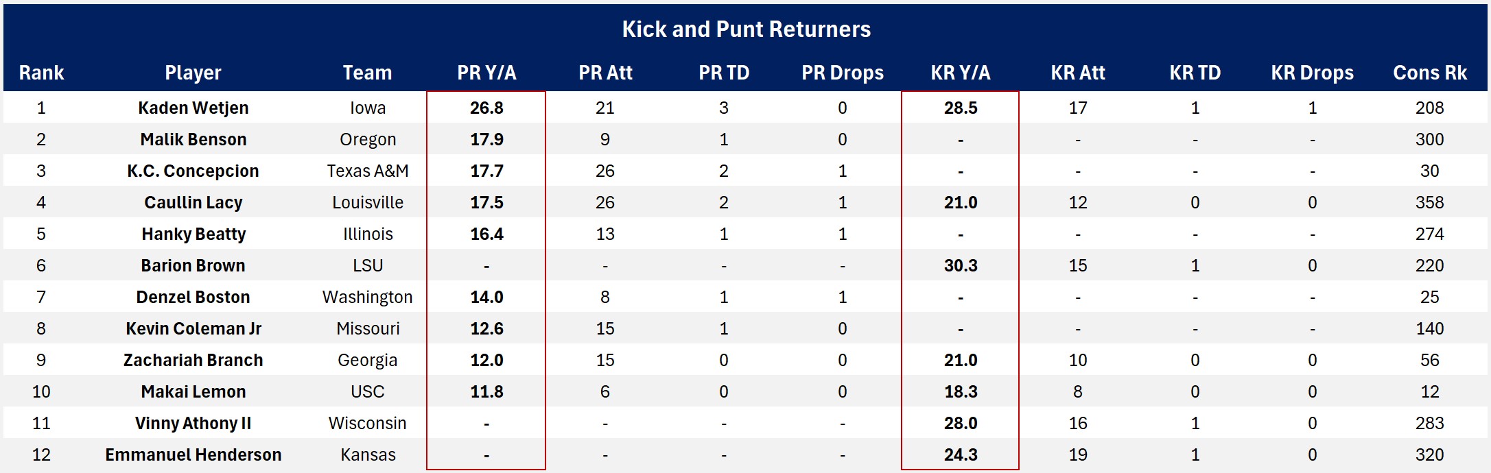 Iowa’s Kaden Wetjen (5-9, 193 lbs, 4.47 40, RAS 6.58) led the entire draft class in punt return average (min 8 total returns) and TDs, not just consensus-ranked players. He was second in kick return average among consensus-ranked WRs, and third among consensus-ranked players. He led the NCAA in return TDs.