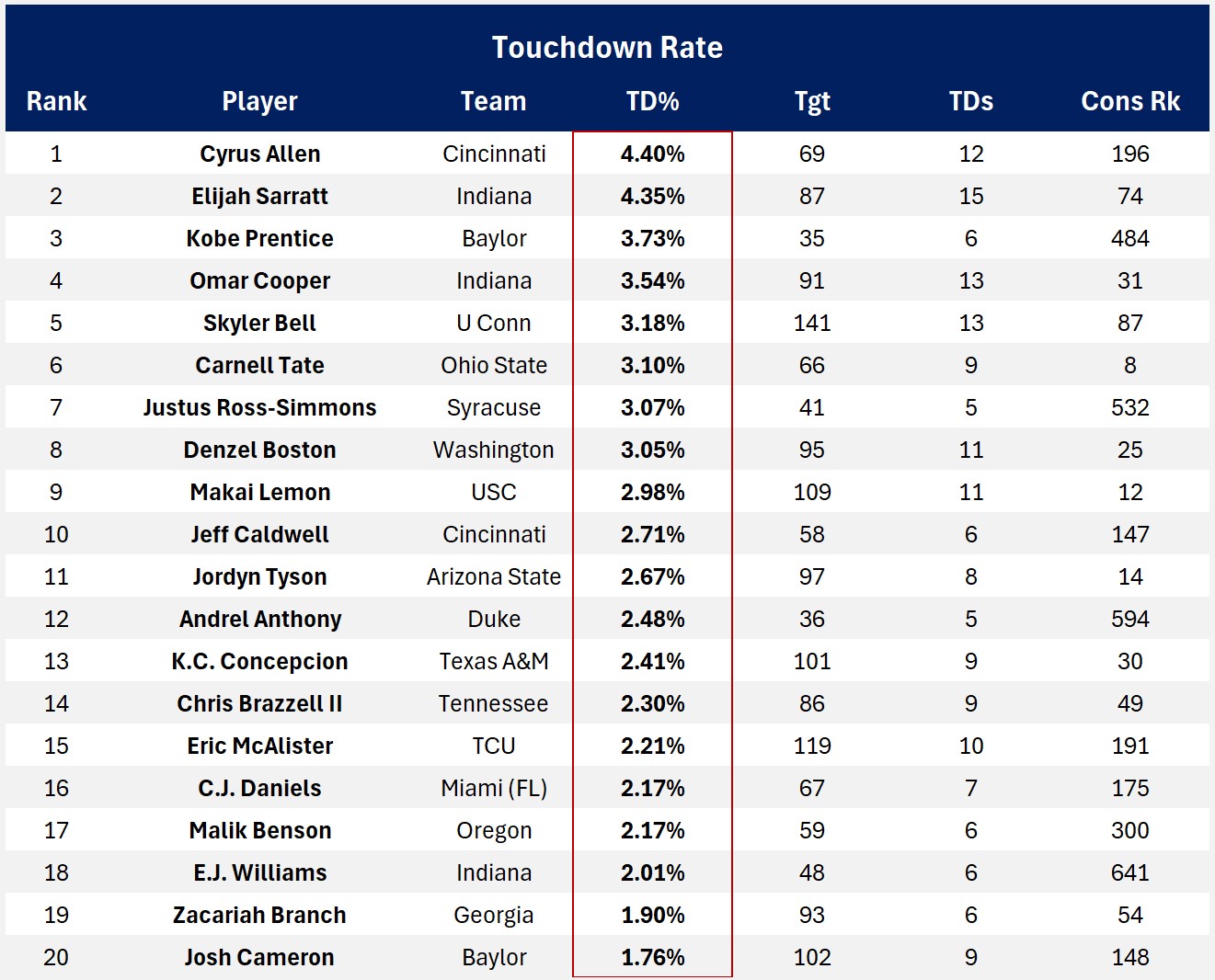 The 2025 TD Rate leader is a relative unknown who Commanders’ fans might want to know more about. Cyrus Allen is a 5-11, 180 lb do-it-all WR. He played his first two college seasons at Louisiana Tech, then transferred to Texas A&M in 2024. He played his fourth season with the Cincinnati Bearcats, where he switched from outside to the slot and broke out with 661 receiving yards and 12 TDs.