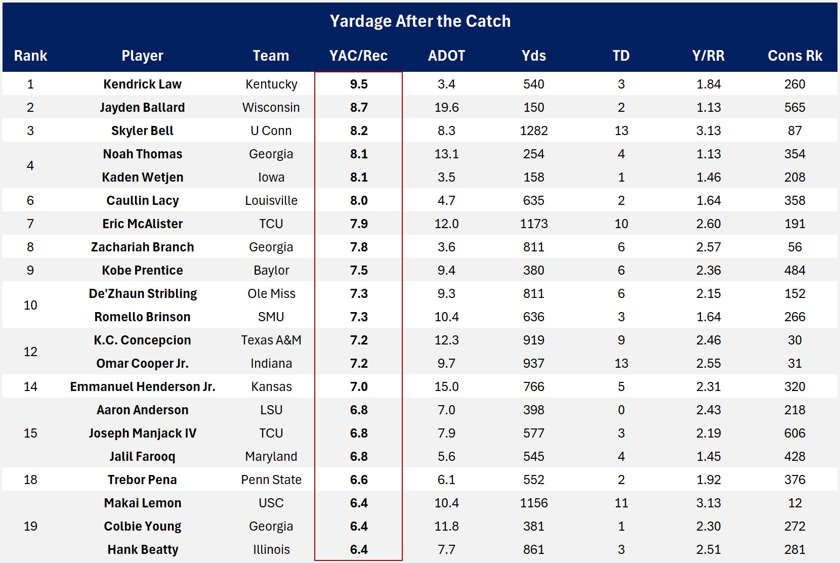 A few well known players were particularly good at generating YAC, including Makai Lemon, K.C. Concepcion, Omar Cooper, Zachariah Branch and Skyler Bell.