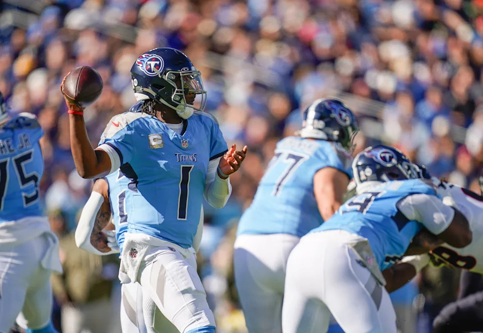 Tennessee Titans quarterback Cam Ward (1) passes during the first quarter against the Houston Texans at Nissan Stadium in Nashville on Nov. 16, 2025.