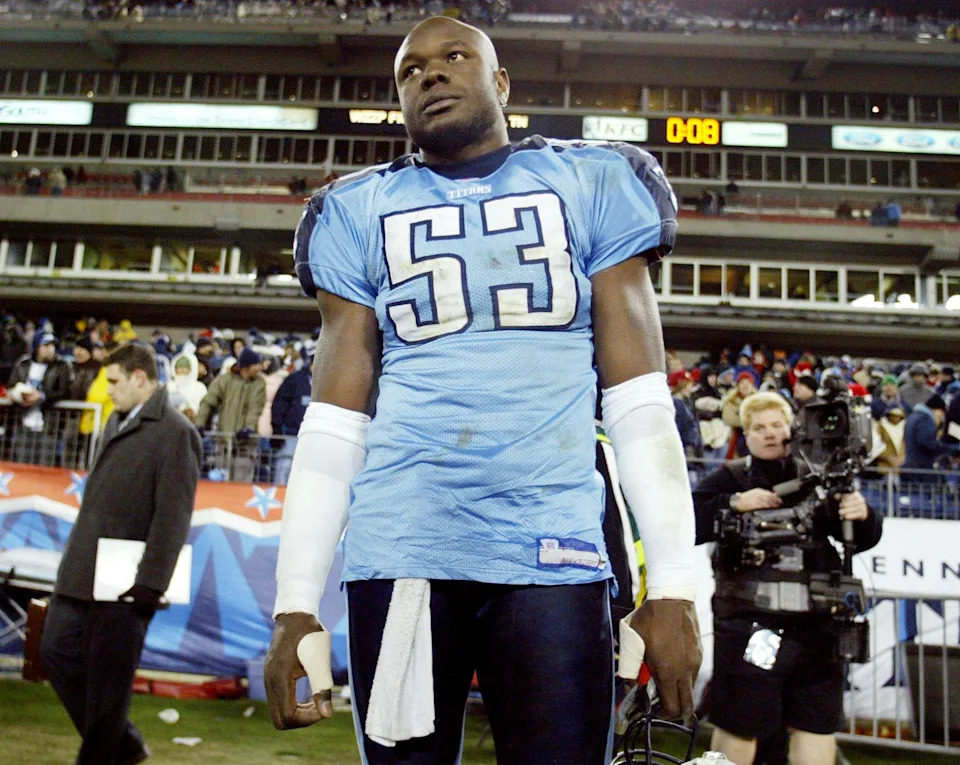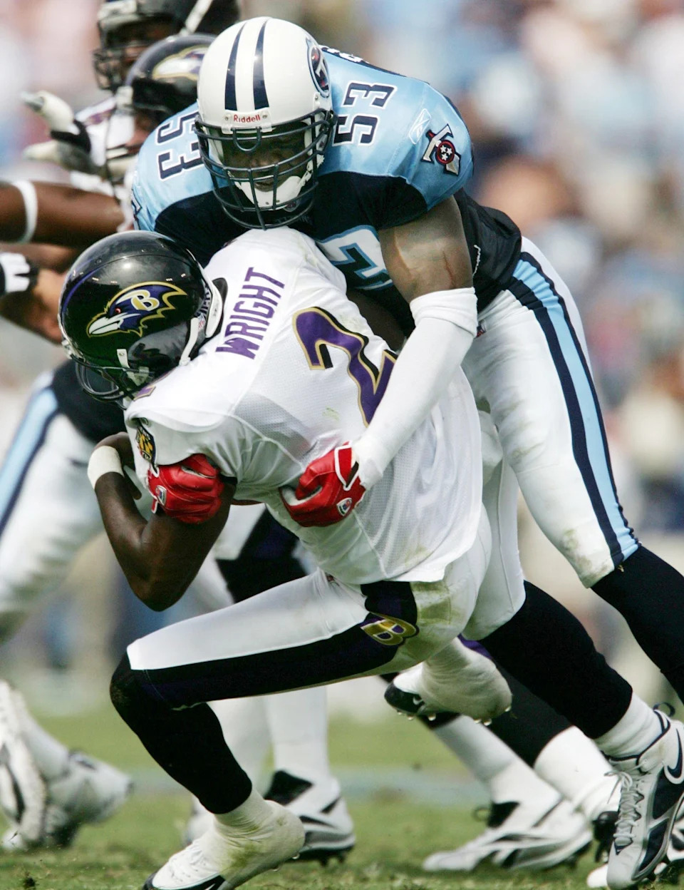 Tennessee Titans linebacker Keith Bulluck (53) sacks Baltimore Ravens quarterback Anthony Wright (2) in the second quarter at the Coliseum on Sept. 18, 2005. The Titans won their home opener 25-10 over the Ravens.