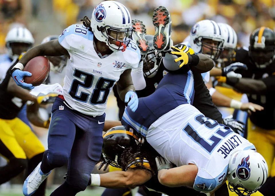 Tennessee Titans running back Chris Johnson (28) speeds past the Pittsburgh Steelers defense during the second quarter at Heinz Field in Pittsburgh on Sept. 8, 2013.