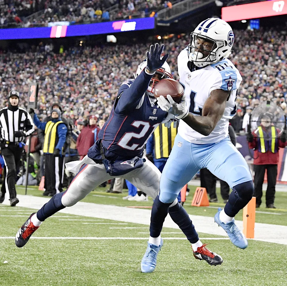 Tennessee Titans wide receiver Corey Davis (84) scores the team’s first touchdown while being defended by New England Patriots cornerback Malcolm Butler (21) during the first half of the AFC Divisional Playoff game at Gillette Stadium on Jan. 13, 2018, in Foxborough, Mass. The Titans lost 35-14 to end their season.