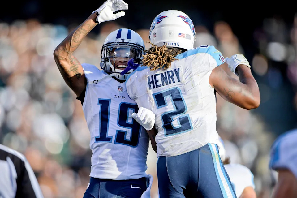 Tennessee Titans running back Derrick Henry (2) celebrates with teammate Tajae Sharpe (19) after scoring a touchdown against the Oakland Raiders during the first half at Oakland-Alameda Coliseum on Aug. 27, 2016. The Titans won 27-14.