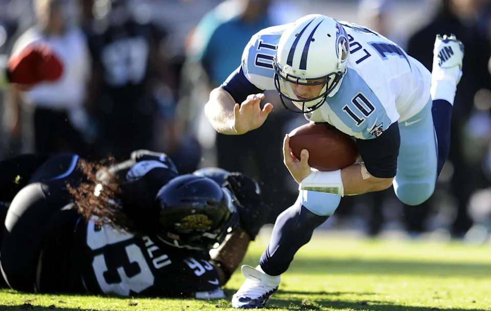 Tennessee Titans quarterback Jake Locker (10) falls to the ground after being tripped by Jacksonville Jaguars defensive tackle Tyson Alualu (93) in the fourth quarter in Jacksonville on Nov. 25, 2012. The Titans were defeated 24-19 by the Jaguars.