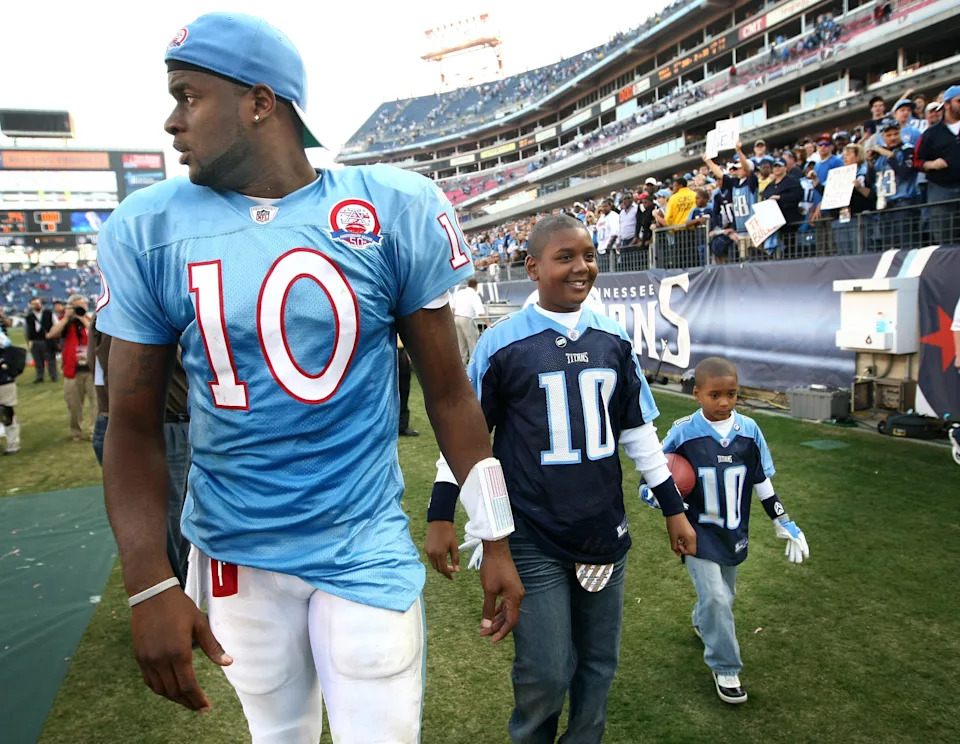 Tennessee Titans quarterback Vince Young (10) walks off the field with the late Steve McNair’s sons, Tyler and Trenton McNair, after the Titans defeated the Buffalo Bills 41 to 17 at LP Field on Nov. 15, 2009.