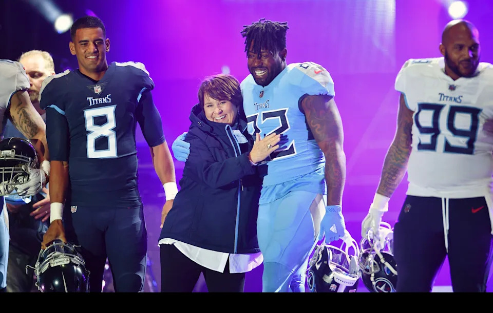 Tennessee Titans tight end Delanie Walker (82) hugs Titans owner Amy Adams Strunk after the Titans revealed their new uniform during a uniform reveal block party downtown Nashville on April 4, 2018.
