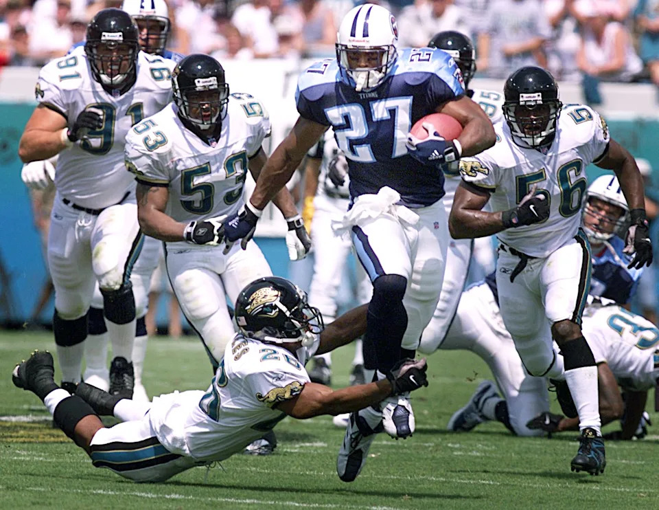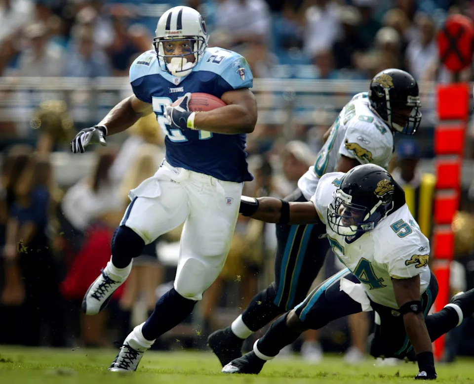 Tennessee Titans running back Eddie George races past Mike Peterson of the Jaguars in the first quarter during their game at Alltel Stadium in Jacksonville on Oct. 26, 2003. The Titans defeated the Jaguars big in a 30-17 victory.