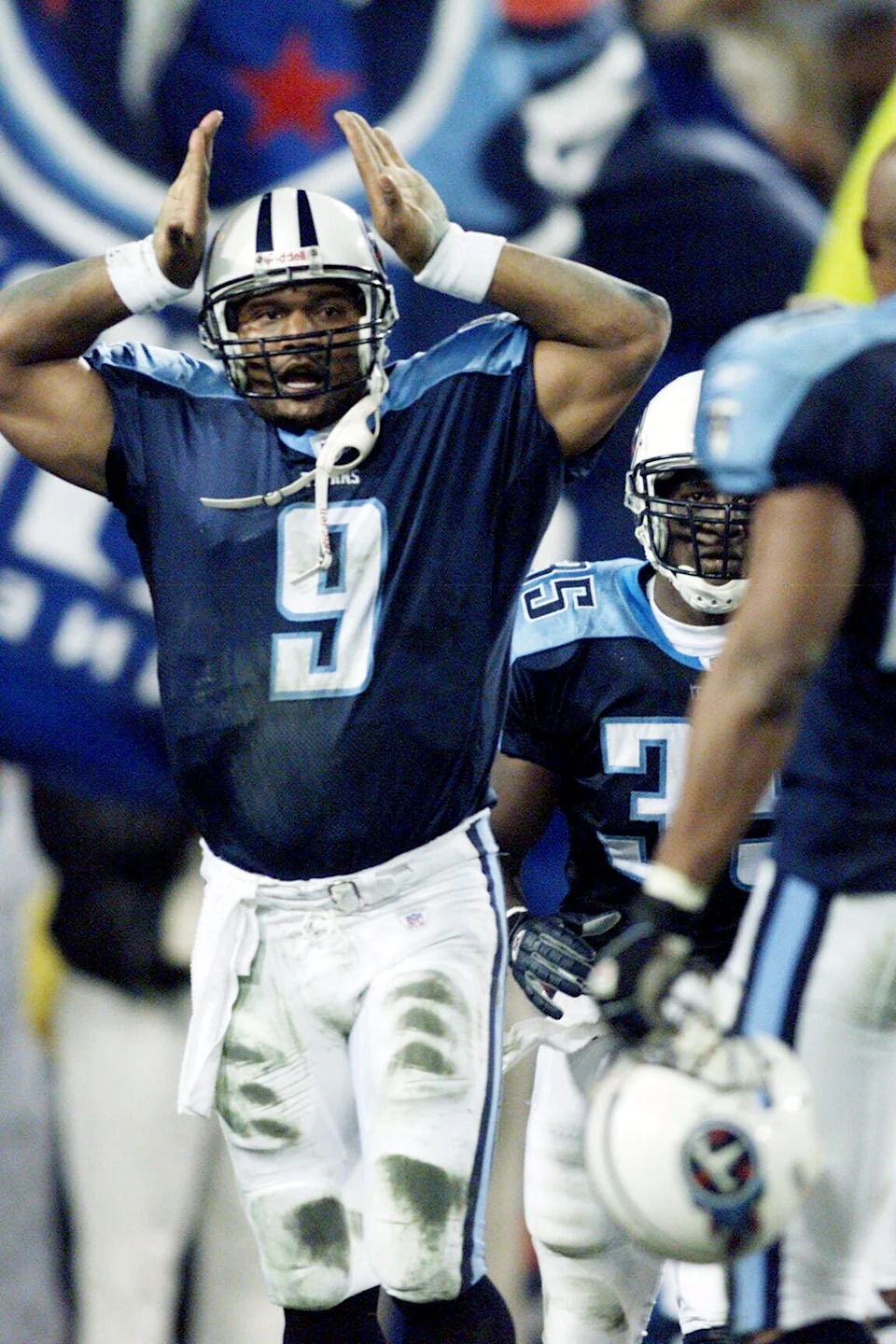 Tennessee Titans quarterback Steve McNair celebrates after scoring the first touchdown during the second quarter against the New England Patriots at the Nashville Coliseum on Dec. 16, 2002. The Titans defeated the Patriots 24-7.