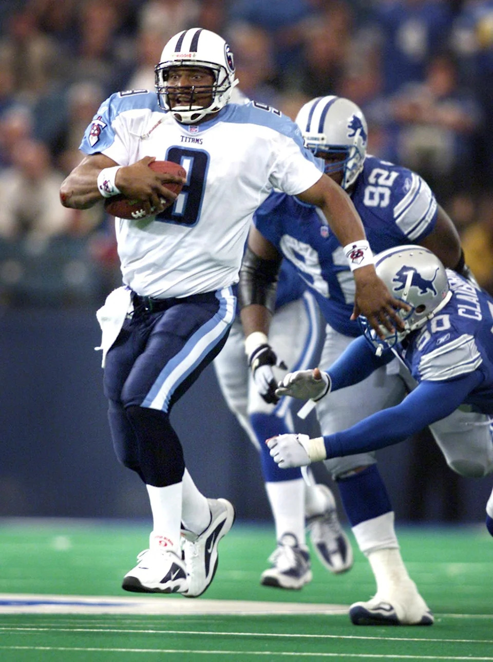 Tennessee Titans quarterback Steve McNair (9) races past defender Chris Clairborne of the Detroit Lions to set up the game winning field goal late in the 4th quarter on Oct. 21, 2001. With the field goal, the Titans take a 27-24 win on the road.