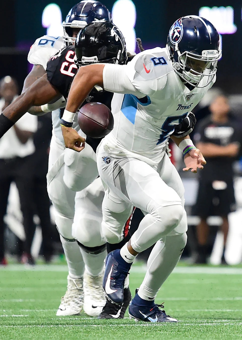 Atlanta Falcons defensive end Adrian Clayborn (99) forces Tennessee Titans quarterback Marcus Mariota (8) to fumble during the fourth quarter at Mercedes-Benz Stadium in Atlanta, Ga., on Sept. 29, 2019.