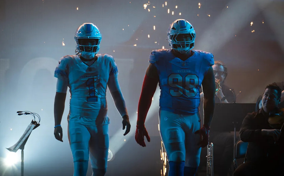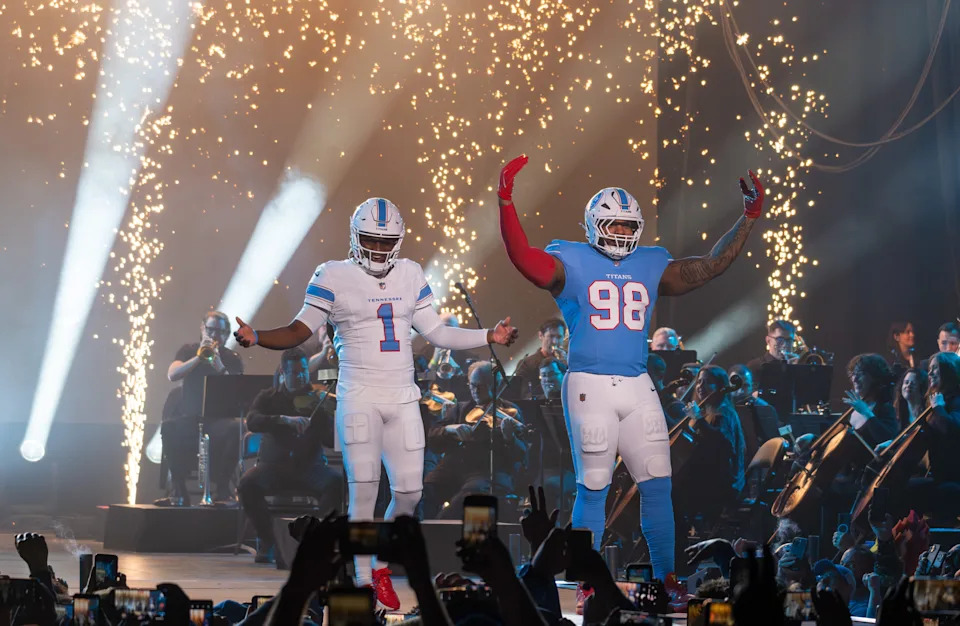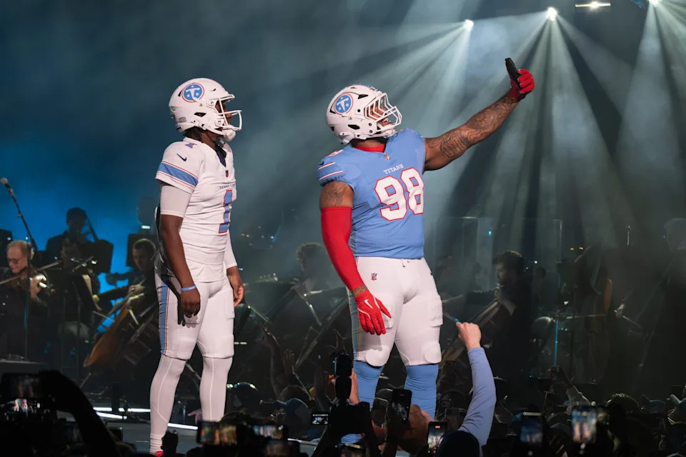 at the Tennessee Titans reveal party for their newly redesigned uniforms at The Pinnacle in Nashville, Tenn., Thursday, March 12, 2026.