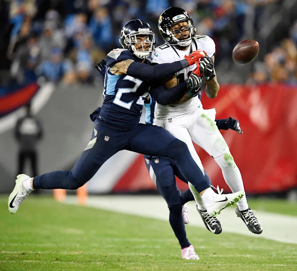 Tennessee Titans safety Kenny Vaccaro (24) breaks up a pass intended for Jacksonville Jaguars wide receiver Donte Moncrief (10) in the third quarter at Nissan Stadium on Dec. 6, 2018. The Titans defeated the Jaguars the second time for the season 30-9.