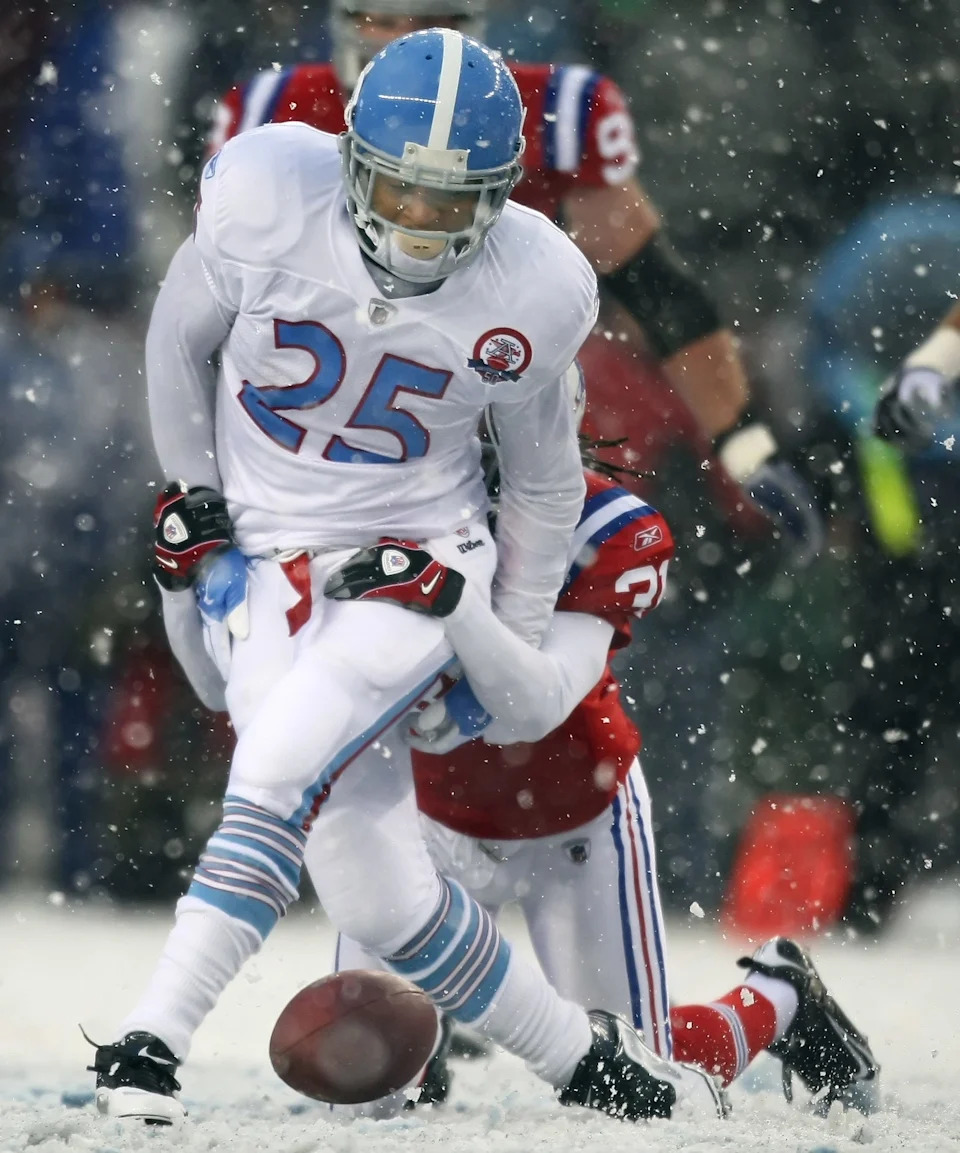 Tennessee Titans running back LenDale White (25) fumbles the football as he is stopped by New England Patriots safety Brandon Meriweather (31) in the second quarter at Gillette Stadium in Foxborough, Mass., on Oct. 18, 2009. The Titans got embarrassed in a 59-0 loss in the snow for their sixth straight defeated of the season.