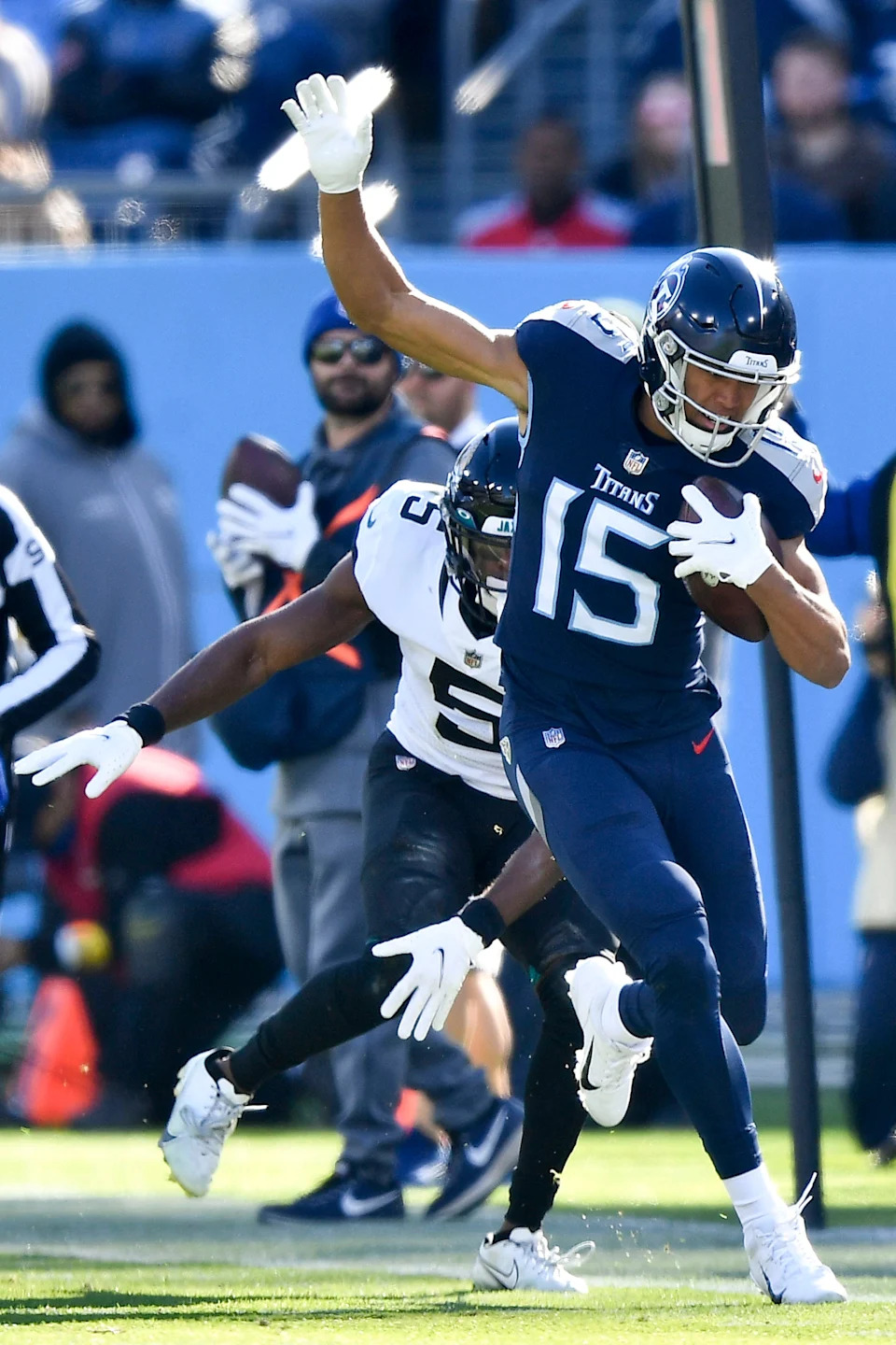 Tennessee Titans wide receiver Nick Westbrook-Ikhine (15) is pushed out of bounds by Jacksonville Jaguars defensive back Rudy Ford (5) on a first down catch during the first quarter at Nissan Stadium in Nashville on Dec. 12, 2021.