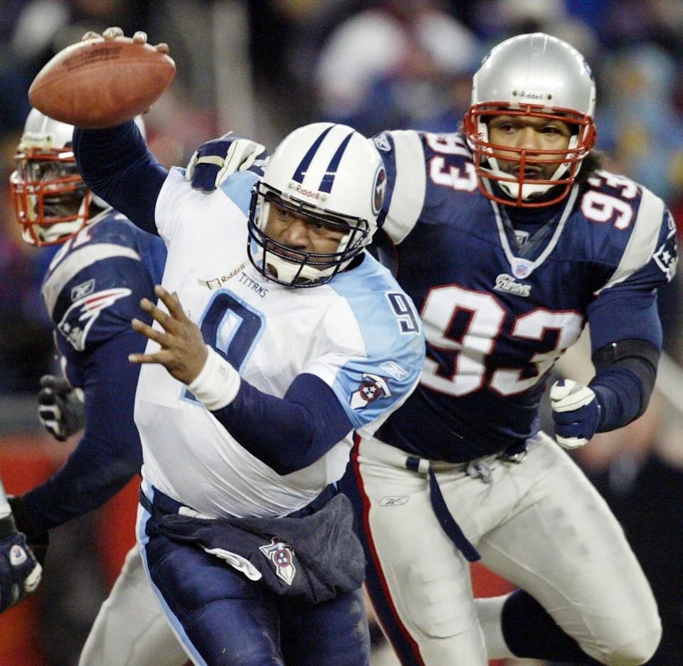 Tennessee Titans quarterback Steve McNair (9) scrambles away from the Patriots’ Richard Seymour in the second quarter at Gillette Stadium in Foxboro during the AFC playoff game on Jan. 10, 2004. The Titans season came to an end with a closed 17-14 defeated.
