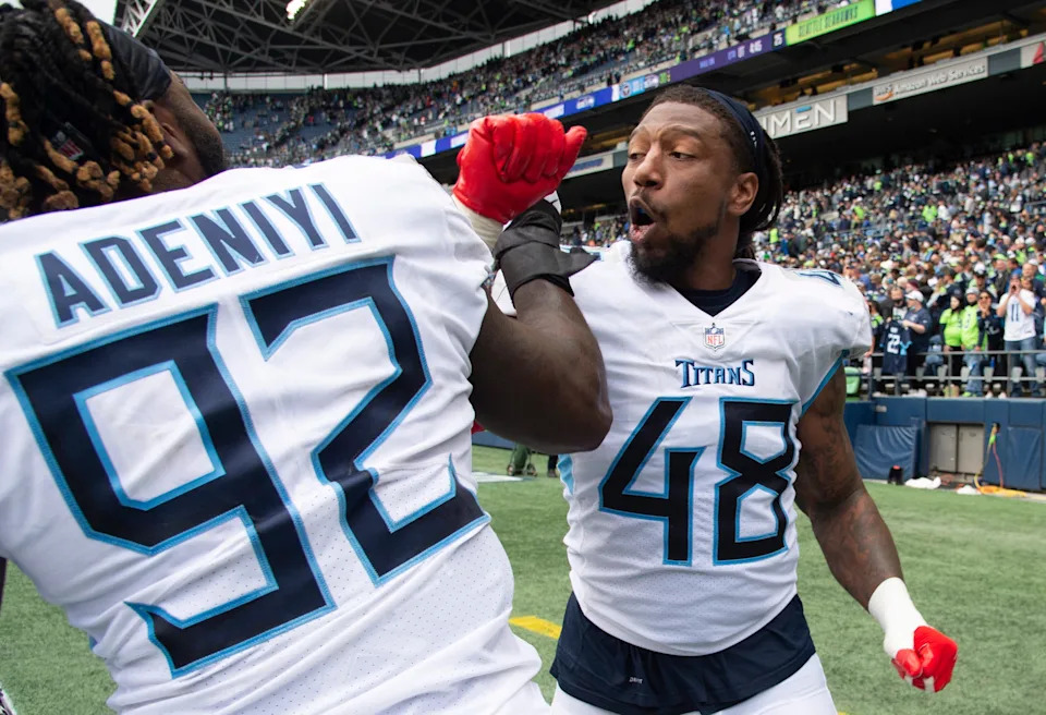 Tennessee Titans linebacker Ola Adeniyi (92) and outside linebacker Bud Dupree (48) celebrate their 33 to 30 overtime win against the Seattle Seahawks at Lumen Field in Seattle, Wash., on Sept. 19, 2021.