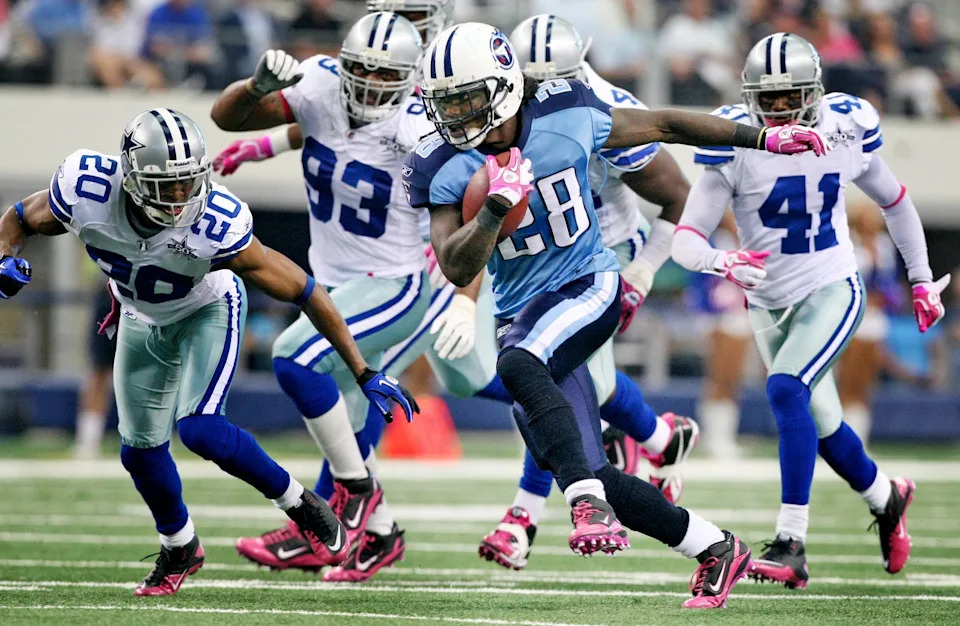 Tennessee Titans running back Chris Johnson (28) speeds past the Dallas Cowboys defense in the second quarter at Cowboys Stadium on Oct. 10, 2010. The Titans defeated the Cowboys 34-27.
