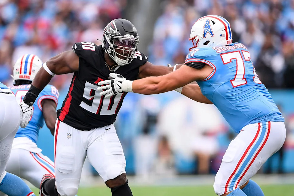 Atlanta Falcons defensive tackle David Onyemata (90) rushes as Tennessee Titans offensive tackle Peter Skoronski (77) defends during the first half at Nissan Stadium in Nashville on Oct. 29, 202.