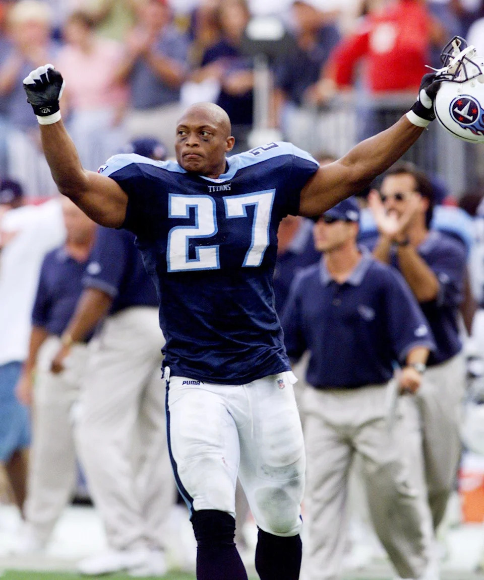 Tennessee Titans running back Eddie George holds his hands in the air after winning 24 to 21 over the St. Louis Rams at the Adelpha Coliseum in Nashville on Oct. 31, 1999.