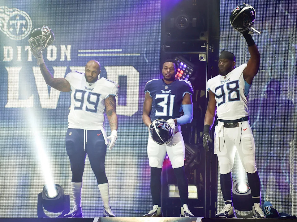 Tennessee Titans defensive tackle Jurrell Casey (99), safety Kevin Byard (31), and linebacker Brian Orakpo (98), show off their new uniforms during the Titans uniform reveal event held at Broadway and 1st Avenue in Nashville on April 4, 2018.