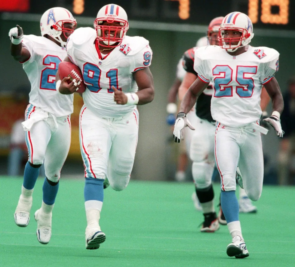 Tennessee Oilers defensive lineman Josh Evans (91) runs the ball back for a touchdown off a fumble by Cincinnati running back Cory Dillon as teammates Darryl Lewis, left, and Denard Walker, right, following him. Officials ruled the Dillion fumble an incomplete pass and called back the touchdown in the third quarter. The Oilers won big, 44-14 over the Bengals at Vanderbilt Stadium on Oct. 18, 1998.