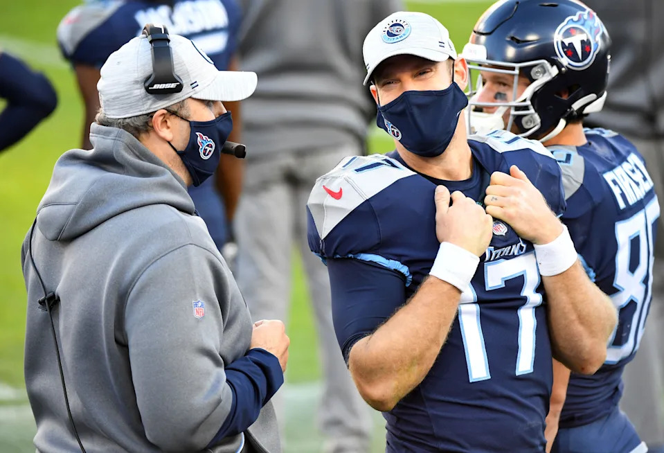 Tennessee Titans quarterback Ryan Tannehill (17) talks with offensive coordinator Arthur Smith at Nissan Stadium in Nashville on Dec 20, 2020.