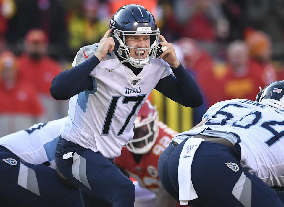 Tennessee Titans quarterback Tannehill (17) calls a play at the line of scrimmage during the AFC Championship game against the Kansas City Chiefs at Arrowhead Stadium on Jan. 19, 2020.