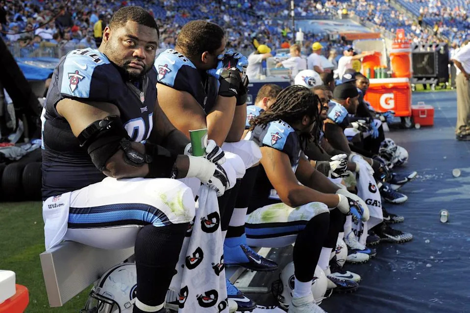 Tennessee Titans nose tackle Sammie Lee Hill (94), left, sulks on the sideline as they are down 30-16 against the Houston Texans near the end of the game at LP Field on Oct. 26, 2014.