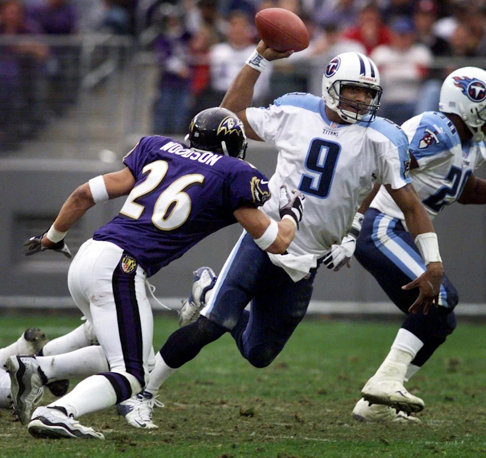 Tennessee Titans quarterback Steve McNair (9) scrambles to make a pass as Baltimore Ravens defensive back Rod Woodson (26) closes in for a sack, but the play ended as an incomplete pass. The Titans got beaten badly 41-14 on the road on Dec. 5, 1999.