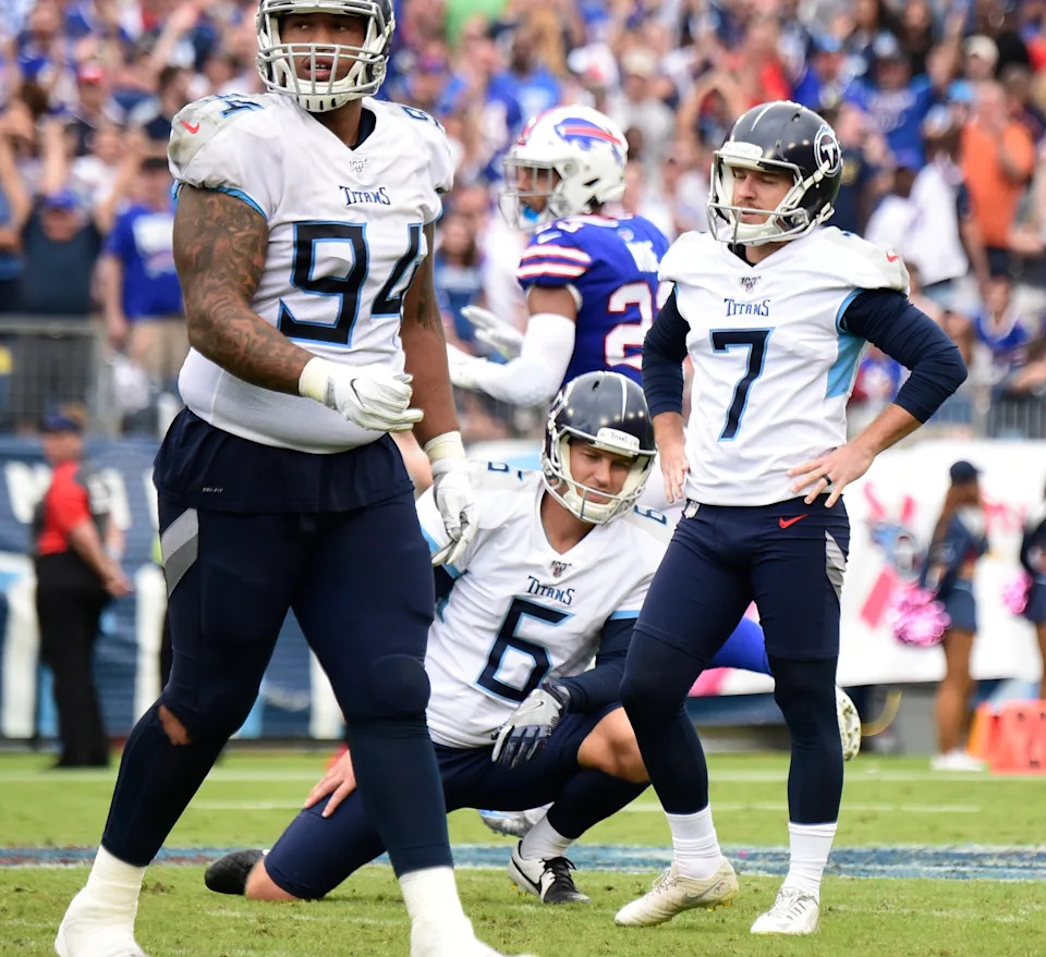 Tennessee Titans kicker Cairo Santos (7) reacts after missing his fourth field goal of the game against the Buffalo Bills at Nissan Stadium in Nashville on Oct. 6, 2019.