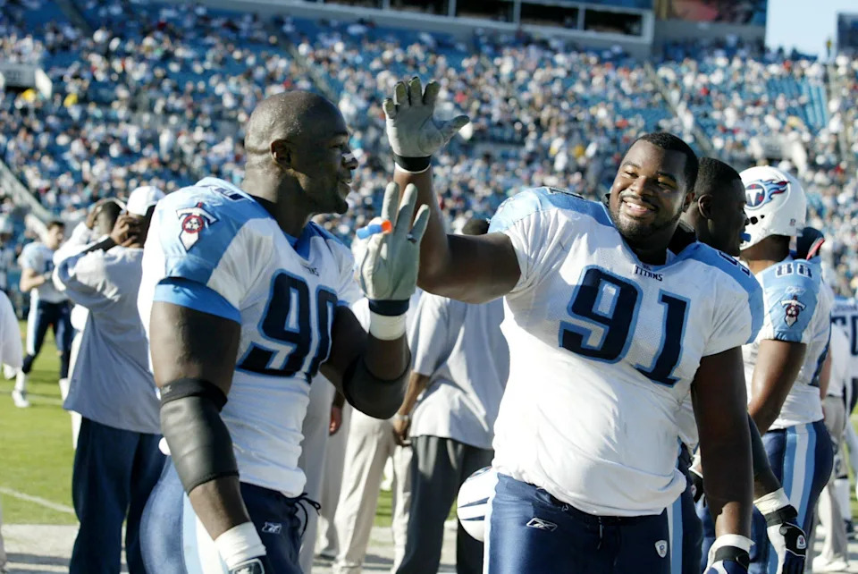 Tennessee Titans defensive linemen Jevon Kearse, left, and Albert Haynesworth celebrate their 28-10 victory over their AFC South foe Jacksonville Jaguars on the sideline late in the fourth quarter at Alltell Stadium in Jacksonville on Dec. 22, 2002.