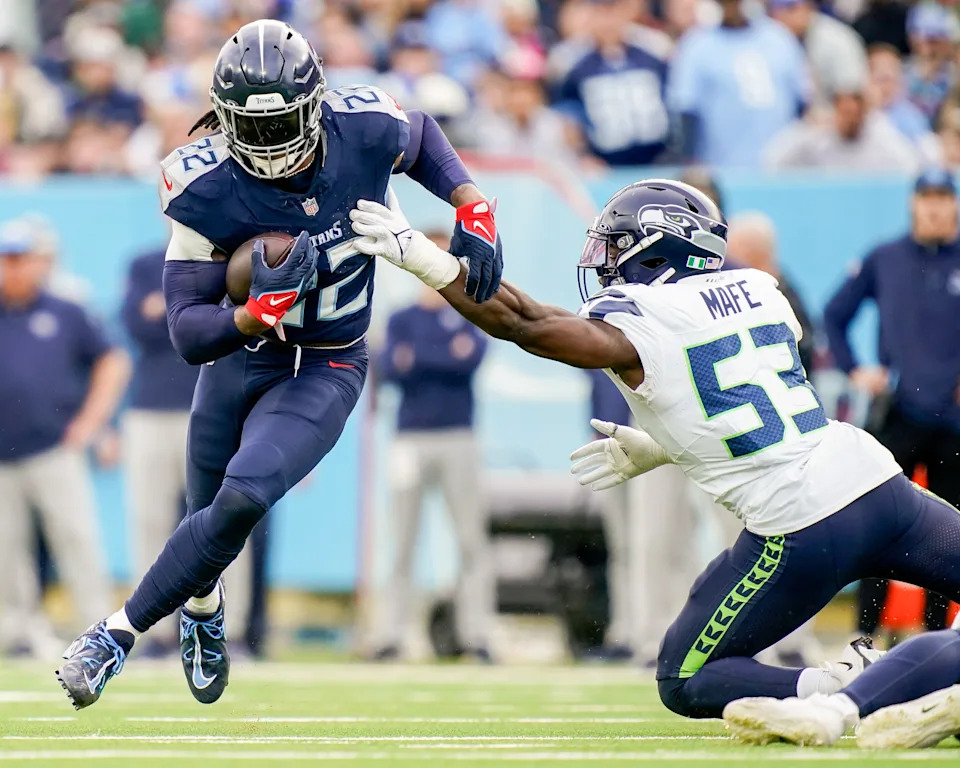 Tennessee Titans running back Derrick Henry (22) evades Seattle Seahawks linebacker Boye Mafe (53) during the fourth quarter at Nissan Stadium in Nashville on Dec. 24, 2023.