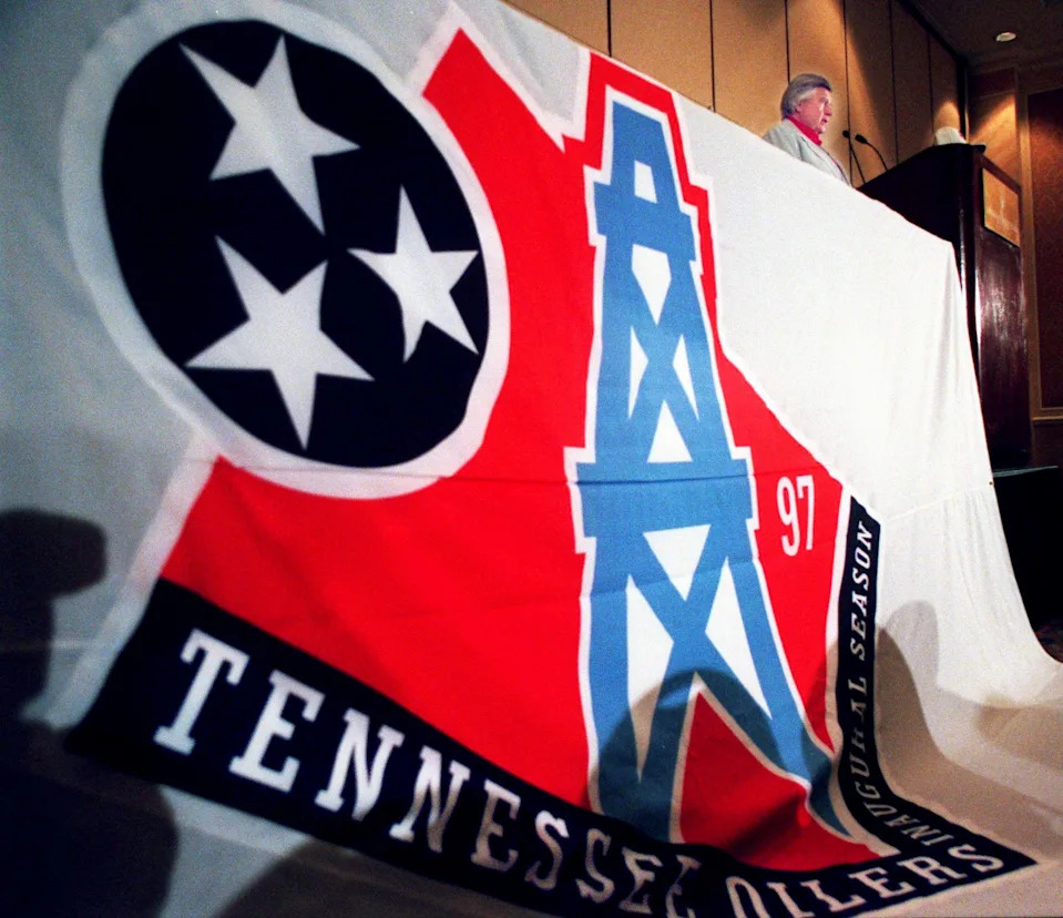 Oiler’s owner Bud Adams, right, and running back Eddie George present an Oilers football jersey bearing the new Tennessee logo on June 12, 1997.