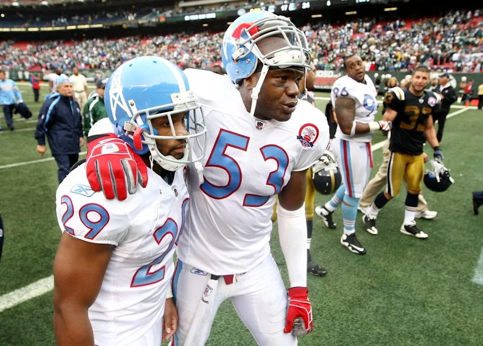 Tennessee Titans linebacker Keith Bulluck (53) talks with teammate cornerback Ryan Mouton (29) following their 24-17 loss to the New York Jets at The Meadowlands on Sept 27, 2009. Mouton fumbled the ball twice on returns and had to fill in for an injured Cortland Finnegan.