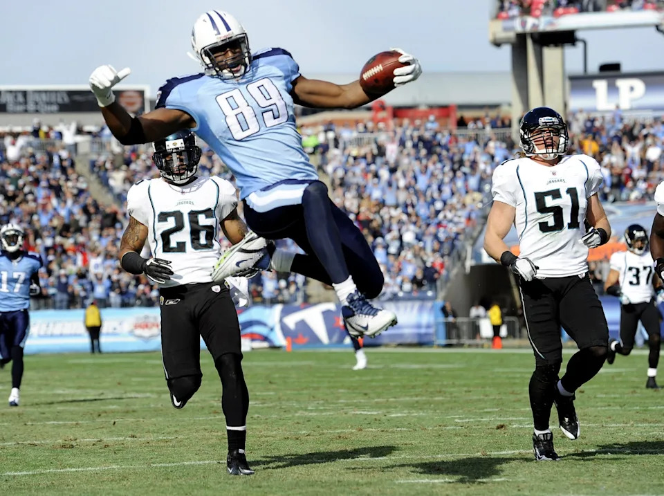 Tennessee Titans tight end Jared Cook (89) leaps into the end zone for a touchdown past Jacksonville Jaguars defenders Dawan Landry (26) and Paul Posluszny (51) at LP Field on Dec. 24, 2011. The Titans defeated the Jaguars 23-17.