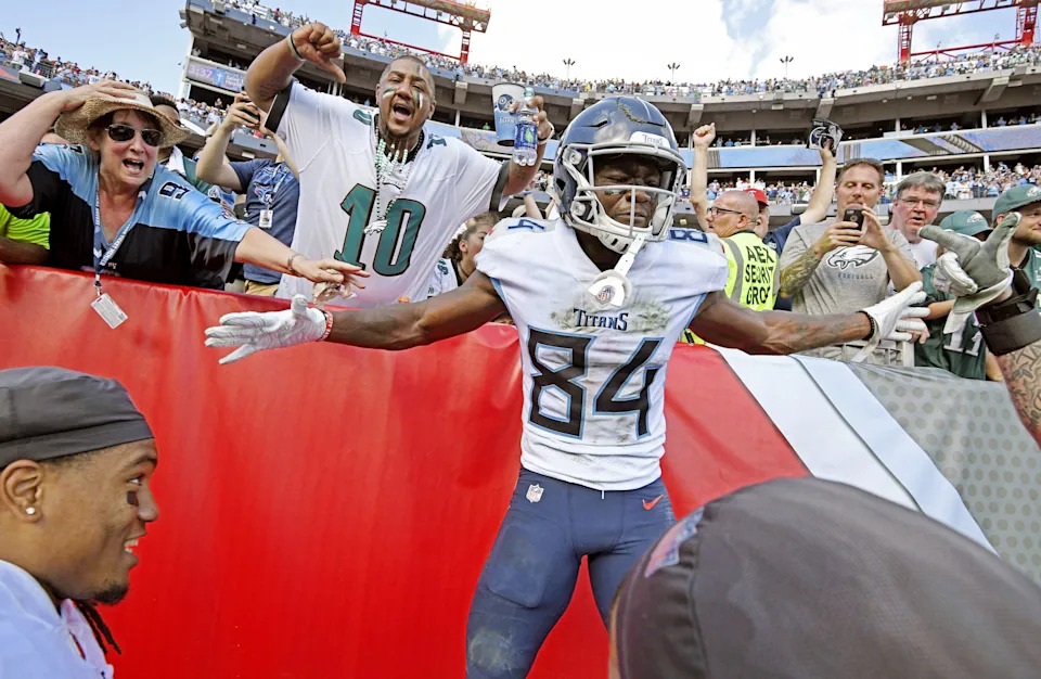 Tennessee Titans wide receiver Corey Davis celebrates his game-winning touchdown in overtime against the Philadelphia Eagles at Nissan Stadium on Sept. 30, 2018. The final score was 26-23.