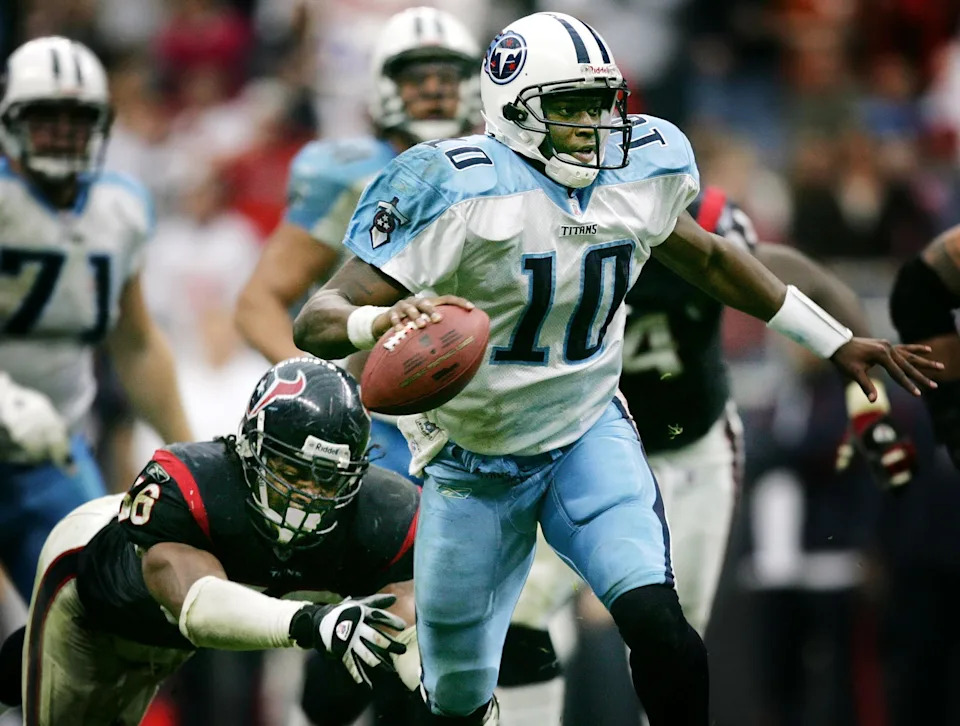Tennessee Titans quarterback Vince Young (10) breaks away from Houston Texans linebacker Morlon Greenwood (56) to score the game winning touchdown on a 39 yard run in overtime at Reliant Stadium on Dec. 10, 2006.
