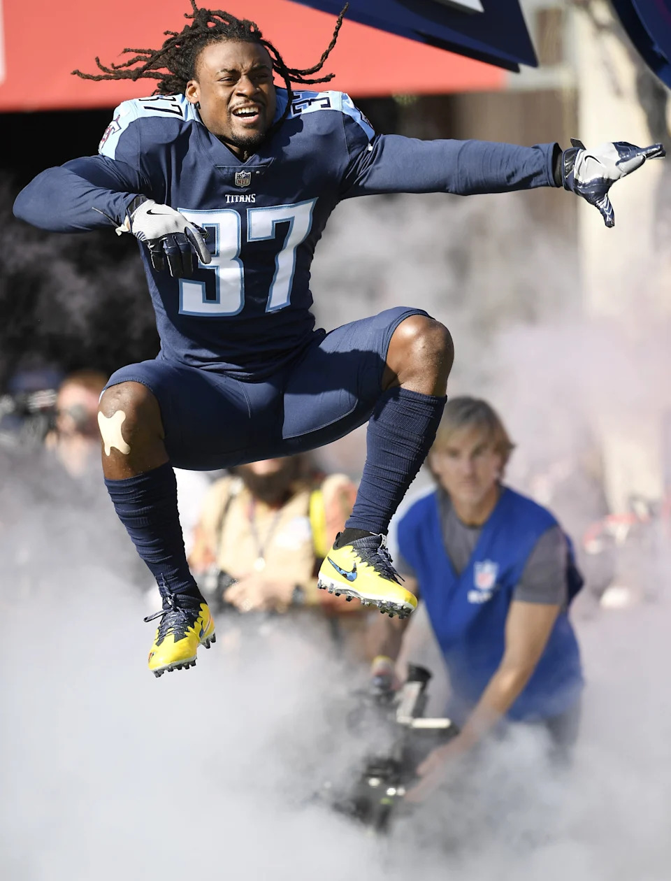 Tennessee Titans safety Johnathan Cyprien (37) jumps during the introductions at Nissan Stadium on Dec. 3, 2017, for their game with the Houston Texans.