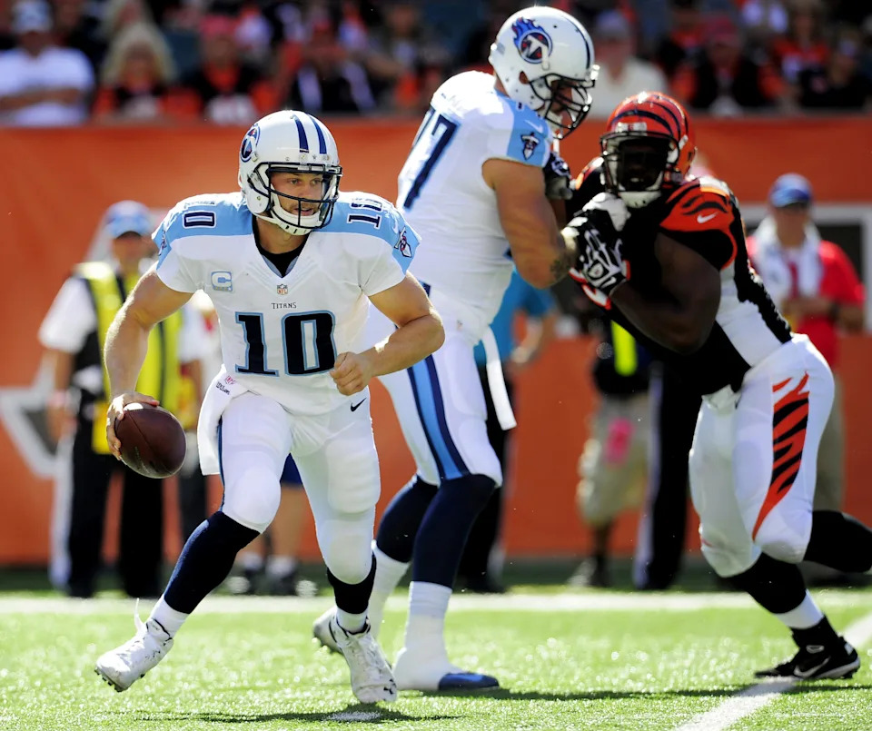 Tennessee Titans quarterback Jake Locker (10) scrambles out of the pocket during the fourth quarter against the Cincinnati Bengals at Paul Brown Stadium on Sept. 21, 2014, in Cincinnati.