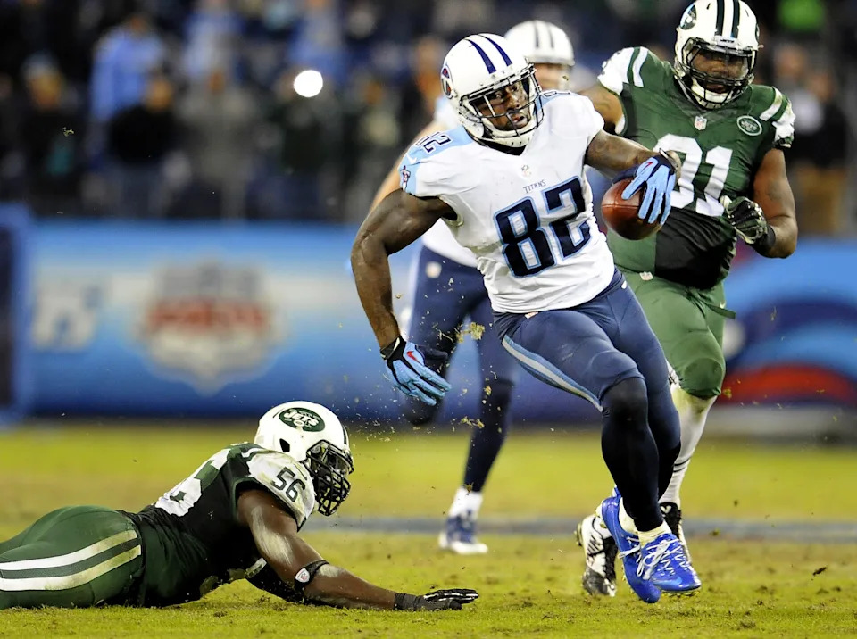 Tennessee Titans tight end Delanie Walker (82) scrambles up the field past New York Jets inside linebacker Demario Davis (56) on the last play of the game at LP Field on Dec. 14, 2014. The Titans lost 16-11.