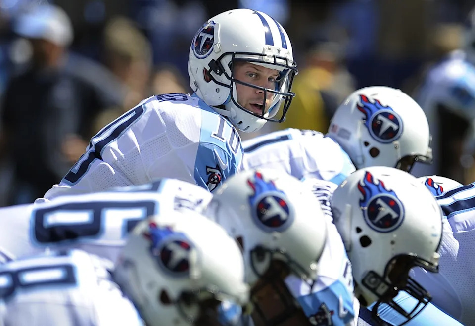 Tennessee Titans quarterback Jake Locker looks over the defense of the New England Patriots in their season opener at LP Field on Sept. 9, 2012. The Titans lost their first game of the season 34-13 to the Patriots.