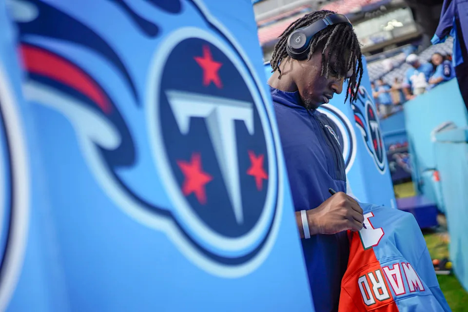 Tennessee Titans quarterback Cam Ward (1) signs autographs for fans before the game against the Indianapolis Colts at Nissan Stadium in Nashville on Sept. 21, 2025.