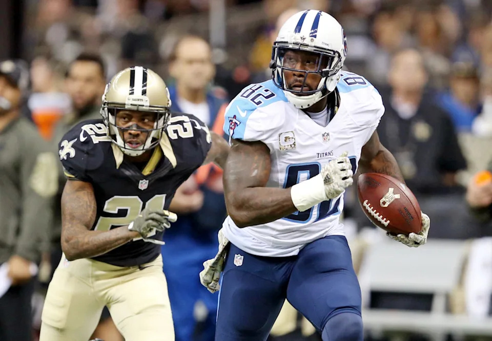 Tennessee Titans tight end Delanie Walker (82) runs from New Orleans Saints cornerback Keenan Lewis (21) for a 61-yard touchdown in the first half of an overtime 34-28 victory against the Saints on Nov. 8, 2015, in New Orleans.