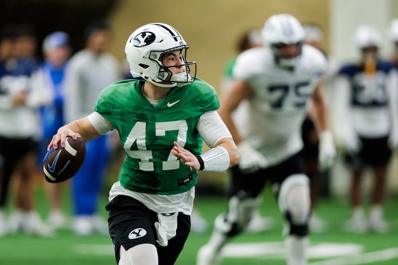 BYU quarterback Bear Bachmeier looks to throw during spring camp on March 6, 2026, in Provo. | Jaren Wilkey/BYU